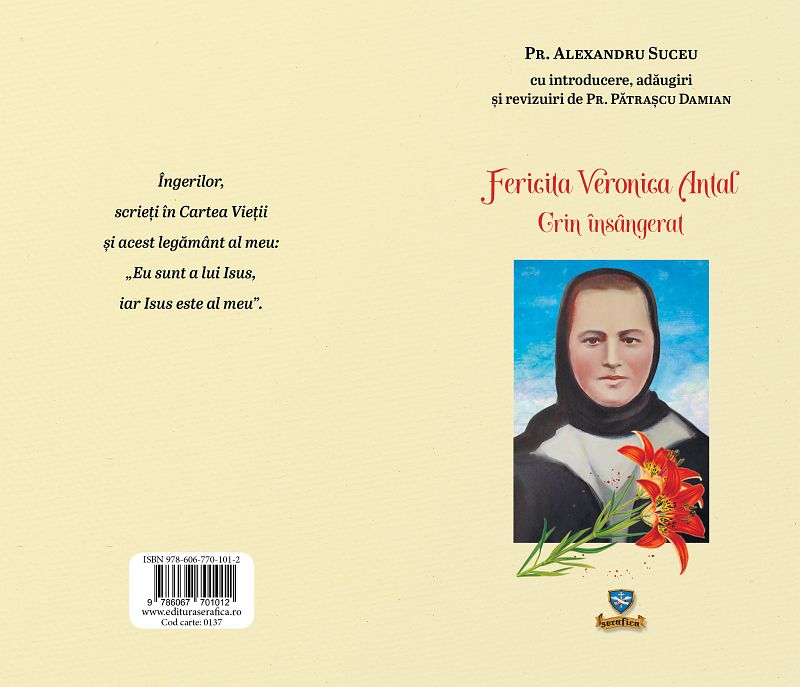 14.08.2018, Roman (Catholica) - Serafica are bucuria să vă recomande una din cele mai noi și emoționante cărți ieșite de sub tiparul editurii noastre, o apariție editorială cu o încărcătură istorică, socială și religioasă deosebită: „Fericita Veronica Antal – Crin însângerat” (format: 11×20 cm; 204 pagini; preț 12 lei). Apărută chiar în luna în care se comemorează martiriul viitoarei Fericite din Nisiporești, cartea poate fi considerată o carte eveniment ce prefațează momentul istoric ce va avea loc pe 22 septembrie, la Nisiporești: beatificarea Veronicăi Antal, prima femeie româncă, prima tânără româncă, primul laic român, al doilea membru al Ordinului Franciscan din România și al șaselea român ridicat la cinstea altarelor.