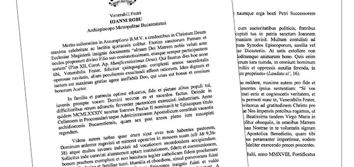 „Veneratului Frate Ioan Robu, Arhiepiscop-Mitropolit de București. Pe bună dreptate, în fiecare an, Solemnitatea Adormirii Maicii Domnului este celebrată cu cel mai mare fast și cu bucurie de către cei care cred în Cristos Domnul. Căci, după învățătura Sfinților Părinți și după renumite documente ale Magisteriului Bisericii, ‘Născătoarea Fiului lui Dumnezeu este propusă în fața ochilor noștri ca fiind întotdeauna în cea mai strânsă legătură cu Fiul său și mereu părtașă de soarta Lui’ (Papa Pius al XII-lea, constituția Apostolică ‘Munificentissimus Deus’). Venerate Frate, în acest an, această zi este pentru Tine una fericită, în care aniversezi 50 de ani de harnică activitate sacerdotală, deci un alt motiv de bucurie deosebită. De aceea este un lucru vrednic și drept să aduci mulțumiri Dumnezeului nemărginit, care singur este bun și dătătorul oricărui bine.