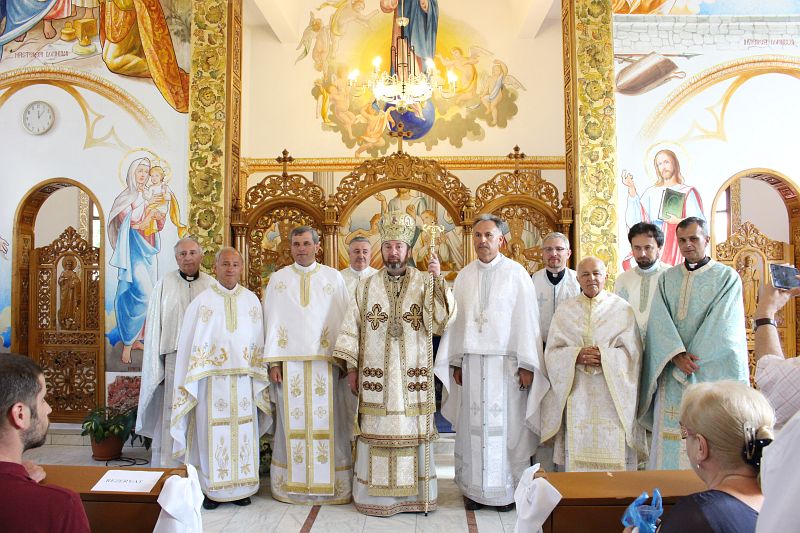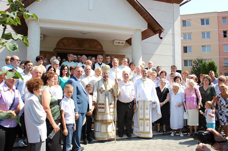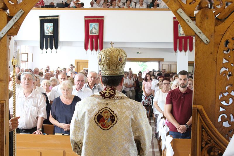 Sfânta Liturghie Arhierească a început la ora 10,00 și a fost celebrată de către Preasfințitul Claudiu. Au concelebrat părintele paroh Ioan Fărcaș, părintele protopop Dan Fodor și alți șase preoți invitați la sărbătoare. Vorbind despre evanghelia duminicii (a Tânărului bogat), Ierarhul a subliniat importanța consacrării locurilor, lucrurilor, dar mai ales consacrarea noastră personală lui Dumnezeu, bucuria de a fi cu Dumnezeu, bucuria de a fi fiu al lui Dumnezeu. Alegerea este a fiecăruia în parte: alegem bucuria și pacea de a fi cu Cristos sau ne îndepărtăm, triști, asemeni tânărului din evanghelia de azi. „Avem totul la poarta sufletului nostru, toate darurile, toate bogățiile, tot ce avem nevoie pentru a fi fericiți în această lume și pentru a moșteni împărăția cerurilor. Totul se rezumă la libertatea noastră: vom deschide sau nu ușa lui Dumnezeu.”