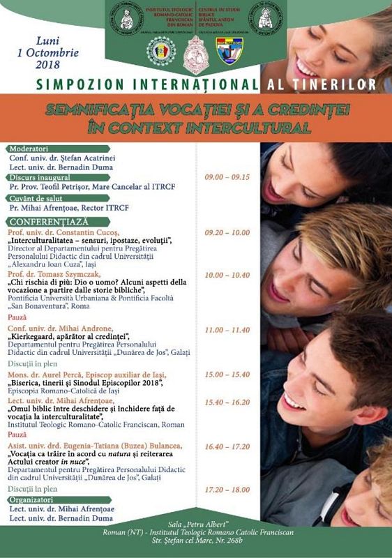 Simțind împreună cu Biserica, Institutul Teologic Romano-Catolic Franciscan din Roman vă invită luni, 1 octombrie 2018, la Simpozionul internațional al tinerilor, cu tema Semnificația vocației și a credinței în context intercultural, voind să vă amintească vouă, dragi tineri și, prin voi, profesorilor, ceea ce Papa Francisc spunea în Scrisoarea către tineri, din 13 ianuarie 2017: „și spre voi Isus își îndreaptă privirea și vă invită să mergeți la el. Preaiubiți tineri, ați întâlnit această privire? Ați auzit acest glas? Ați simțit acest impuls de a porni la drum?… Acest lucru va fi posibil în măsura în care, și prin însoțirea făcută de călăuze experte, veți ști să întreprindeți un itinerar de discernământ pentru a descoperi proiectul lui Dumnezeu cu privire la viața voastră”.