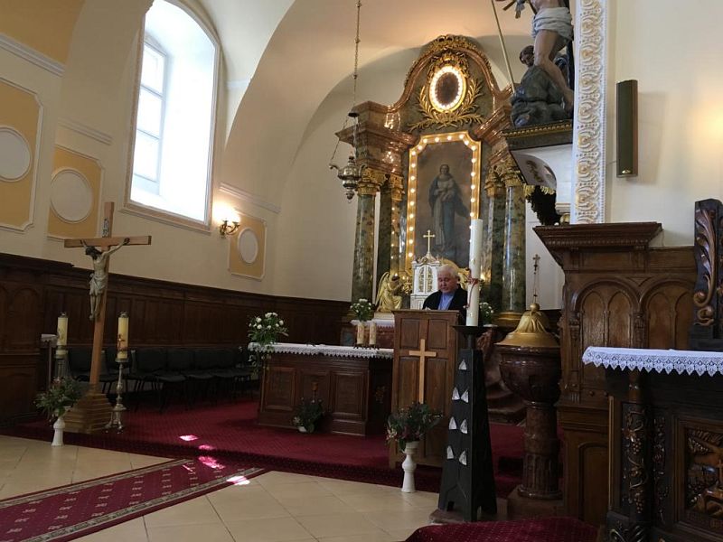 Celebrarea a fost urmată de masa de prânz, tot la Slatina Timiș, după care autocarul cu pelerini s-a întors spre Timișoara prin localitățile Buziaș și Bacova. În biserica parohială a acestei localități, din urmă, dedicată Sf. Ioan Nepomuk, angajații Episcopiei și colaboratorii parohiali au fost întâmpinați de câțiva credincioși, de directorul Caritas-ului diecezan, Herbert Grünn și de paroh, pr. Szilárd Vodila, care a prezentat povestea impozantului lăcaș de cult. El a relevat situația multor credincioși din Bacova, care azi trăiesc mai mult în străinătate, întorcându-se acasă de câteva ori pe an. La rugămintea părintelui paroh, Preasfințitul a binecuvântat mai multe cruciulițe, pentru toți cei prezenți, biserica fiind primul lăcaș de cult din Dieceză în care noul ierarh a activat ca paroh în 1985. Pe atunci el primise în administrare trei parohii și șase filiale.