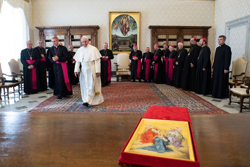 Întâlnirea Episcopilor români cu Sfântul Părinte a avut loc după ce aceștia au concelebrat Sf. Liturghie împreună cu Sanctitatea Sa în Capela Sfânta Marta. Acest moment de comuniune a Episcopilor din România și Republica Moldova cu Urmașul lui Petru a fost punctul central al vizitei ad limina apostolorum pe care CER și Episcopul de Chișinău au efectuat-o la Roma în perioada 5-10 noiembrie 2018. Icoana este realizată de artistul român Radu Iulian și reproduce o scenă din fresca în ulei din altarul central al Catedralei Sf. Iosif, care reprezintă Încoronarea în Cer, de către Preasfânta Treime, a Sfintei Fecioare Maria. Oferindu-i Papei Francisc cadoul, ÎPS Ioan Robu i-a descris Suveranului Pontif icoana, pe care Sanctitatea Sa a primit-o cu bucurie și apreciere. (foto: L’Osservatore Romano și CER)