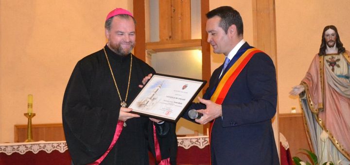 După acest moment de bucurie și recunoștință pentru cei doi Episcopi, primarul a conferit titlul de cetățean de onoare al Municipiului Baia Mare Preasfințitului Părinte Vasile Bizău – Episcop greco-catolic de Maramureș. „Voi face cu foarte mult drag, cu foarte multă recunoștință pentru echilibrul adus zilei de azi aici din Maramureș, în Baia Mare, și voi face acest gest pentru Ierarhul nostru într-un semn simbolic pentru echilibrul pe care ni-l dorim, pentru așezarea bisericii noastre aici în Baia Mare acolo unde îi este locul și pentru a arăta că smerenia, modestia, eleganța și diplomația, pe care le are un ierarh al Bisericii Greco-Catolice, nu înseamnă în raport cu alții decât dragoste, pace, frățietate și nu lipsă de autoritate. Acest spirit de pace pe care le-a insuflat în comunitatea noastră și eleganța, diplomația, șlefuirea intelectuală, pe care n-o recunoaștem numai noi aici, ci o recunosc toți ceilalți cetățeni ai orașului, nu fac decât să ne bucure că avem în mijlocul nostru și în vârful ierarhiei catolice omul potrivit, care așază lucrurile într-un mod potrivit. Din această dragoste pentru Preasfințitul Părinte Vasile Bizău, permiteți-mi să ofer titlul de cetățean de onoare al Municipiului Baia Mare Preasfințitului Părinte Vasile Bizău, Episcop greco-catolic de Maramureș”, a concluzionat Cătălin Cherecheș.