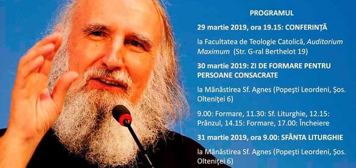 Vineri, 29 martie 2019, ora 19.15, Pr. Grün va susține o conferință cu tema „Reconciliere și vindecare” în sala Auditorium maximum a Facultății de Teologie Romano-Catolice din cadrul Universității București. Intrarea la conferință este liberă. Sâmbătă va fi o zi de formare pentru persoanele consacrate, organizată la Mănăstirea Sf. Agnes (Congregatio Jesu) din Popești-Leordeni, Șos. Olteniței 6. Programul include: momente de formare, la ora 9.00 și 14.15; Sf. Liturghie, la ora 11.00. Duminică, 31 martie 2019, ora 9.00, pr. Anselm Grün va prezida Sf. Liturghie în biserica Mănăstirii Sf. Agnes din Popești Leordeni.