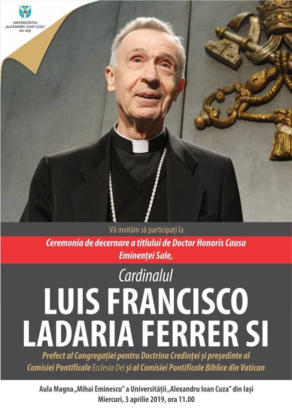 28.03.2019, Iași (Catholica) - Miercuri, 3 aprilie 2019, Universitatea „Alexandru Ioan Cuza” din Iași va conferi titlul de Doctor Honoris Causa Eminenței Sale Cardinalul Luis F. Ladaria, prefect al Congregației pentru Doctrina Credinței și președinte al Comisiei Pontificale „Ecclesia Dei” și al Comisiei Pontificale Biblice din Vatican. Evenimentul va avea loc în Aula Magna „Mihai Eminescu”, începând cu ora 11:00.