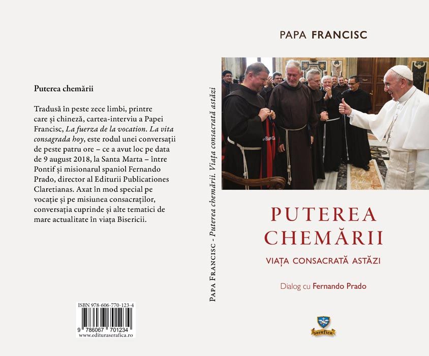17.04.2019, Roman (Catholica) - La Editura Serafica a apărut „Puterea chemării. Viața consacrată astăzi. Dialog cu Fernando Prado”, carte-interviu cu Papa Francisc, tradusă de pr. Virgil Blaj OFMConv. Cartea apare în format 10,5x18cm, are 144 de pagini și poate fi procurată de la Librăria „Sfântul Anton de Padova” din Roman (www.edituraserafica.ro), precum și de la celelalte librării catolice din țară la prețul de 16 lei. Publicată în contextul apropiatei vizite a Papei Francisc în România, din 30 mai – 2 iunie 2019, cartea este rezultatul a peste trei ore de interviu acordat lui Fernando Prado, preot claretian, director editorial al Publicaciones Claretianas, profesor de Teologia misiunii la Institutul de Viață Religioasă din Madrid. Dincolo de forma clasică a interviului, autorul și-a propus mai mult o convorbire în care să iasă la lumină sufletul Papei Francisc de persoană consacrată.