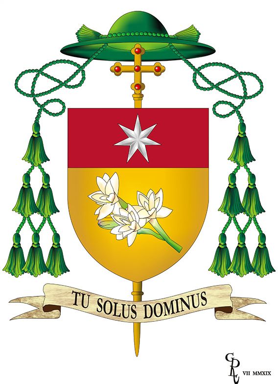 30.07.2019, Iași (Catholica) - Potrivit tradiției heraldice a Bisericii Catolice, stema unui Episcop este în mod obișnuit compusă din: un scut, care poate să aibă diferite forme (dar în care se poate vedea mereu asemănarea cu un scut heraldic) și care conține simboluri preluate din idealuri personale sau din tradiții de familie, sau chiar cu referințe la propriul nume, mediul de viață și altele; o cruce procesională cu un braț transversal, de aur, pusă pe o lance de lemn, așezată vertical în spatele scutului; o pălărie de prelat (galero), cu cordoane cu 12 canafuri, atârnând câte 6 pe fiecare parte (așezate, de sus în jos, în 1, 2, 3) toate de culoare verde; o bandă în partea de jos, cu extremitățile bifide, purtând motoul scris de obicei cu negru.