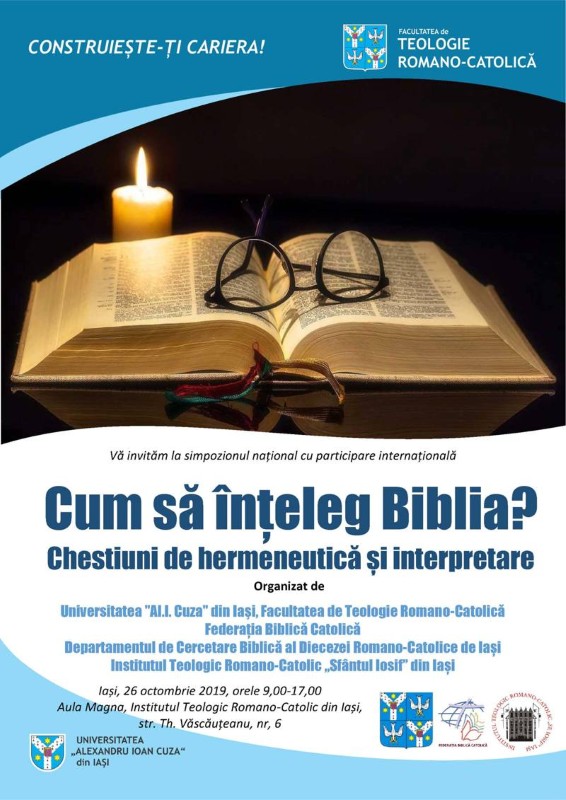 16.10.2019, Iași (Catholica) - Facultatea de Teologie Romano-Catolică din cadrul Universității „Alexandru Ioan Cuza” din Iași, împreună cu Departamentul de Cercetare Biblică al Diecezei Romano-Catolice de Iași, organizează un simpozion cu participare internațională având drept temă „Cum să înțeleg Biblia? Chestiuni de hermeneutică și interpretare”. Colaboratori sunt Institutul Teologic Romano-Catolic „Sf. Iosif” din Iași și Federația Biblică Catolică.