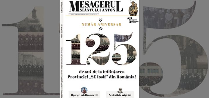 11.08.2020, Roman (Catholica) - Se împlinesc, dragi cititori, 125 de ani de la înființarea canonică a Provinciei franciscane „Sf. Iosif” din România. Cu această ocazie, noul număr al revistei noastre are un caracter și o coloratură aparte. Își propune, prin mai multe articole, să sublinieze aniversarea mai sus amintită. Se face referire la unii frați ai provinciei noastre, mai cu seamă la cei ce ne-au fost exemple de trăire a spiritualității franciscane. Pe lângă acestea, veți afla și reflecții asupra unor diferite tematici, cum ar fi: sănătatea vieții spirituale, graba omului contemporan, franciscanism, spiritualitate antoniană și mariană, crizele politice, percepția timpului, libertate și curăție etc.