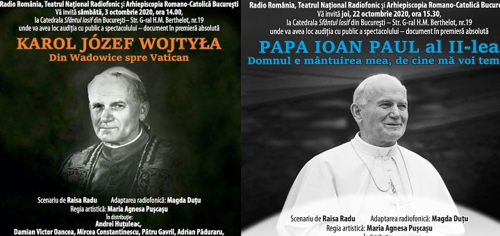 30.09.2020, București (Catholica) - Arhiepiscopia Romano-Catolică de București și Teatrul Național Radiofonic – Radio România vă invită să participați la audiția cu public în premieră absolută a două spectacole-document, dedicate centenarului Sfântului Papă Ioan Paul al II-lea: „Karol Jósef Wojtyła: Din Wadowice spre Vatican”, sâmbătă, 3 octombrie 2020, ora 14, și „Papa Ioan Paul al II-lea: Domnul e mântuirea mea, de cine mă voi teme?”, joi, 22 octombrie, ora 15.30. Ambele spectacole vor avea loc în aer liber, în curtea Catedralei Sf. Iosif, în condiții de siguranță, conform normelor sanitare în vigoare pentru prevenția Covid-19.