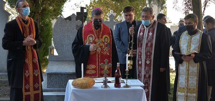 02.11.2021, Blaj (Catholica) - Luni, 1 noiembrie 2021, în cimitirul de lângă „Bisericuța grecilor” din Blaj s-a săvârșit slujba de pomenire a celor adormiți în Domnul. Slujba Parastasului a fost oficiată de Preasfințitul Cristian, Episcop auxiliar de Alba Iulia și Făgăraș, care i-a avut alături pe pr. Cristian Rus, protopop de Blaj, pr. Florian Guțiu, rectorul Seminarului Arhiepiscopal Major „Buna Vestire” și pr. Ciprian Suciu, vice-rectorul aceleași instituții, răspunsurile fiind oferite de seminariștii blăjeni.