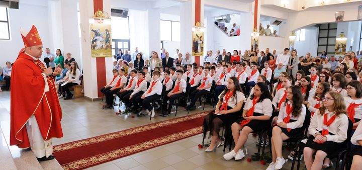 07.06.2022, Iași (Catholica) - 77 de copii și tineri au primit Sacramentul Sfântului Mir în ziua de duminică, 5 iunie 2022. Liturghia a fost prezidată de PS Petru Sescu, Episcop auxiliar de Iași, alături fiind pr. paroh Gabriel Bucur, mai mulți preoți și seminariști. PS Petru Sescu a fost întâmpinat de părintele paroh, de pr. diacon Alexandru Robu și bineînțeles de candidații la Sacramentul Confirmațiunii, lângă care au stat părinții și nașii acestora. În cuvântul de învățătură, Preasfințitul Petru le-a vorbit copiilor și tinerilor despre importanța Sfântului Duh și a Sacramentului Sfântului Mir. După predică, a urmat mărturisirea de credință a candidaților ce au jurat în fața tuturor că se leapădă de Satana și îl aleg doar pe Dumnezeu ca exemplu în viața lor.
