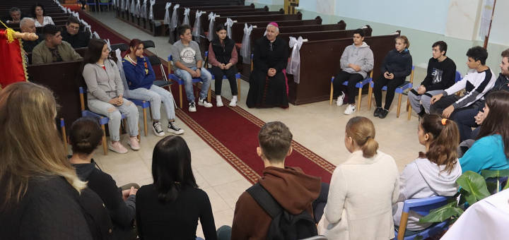 La sfârșitul Sfintei Liturghii s-a rostit Rugăciunea parcursului sinodal, după care Episcopul diecezan a binecuvântat steagul pe care se află două gobeline realizate de către enoriașa Erzsébet Liszanek, care între timp a trecut la casa Tatălui ceresc, și dăruit ulterior bisericii de către soțul acesteia. Steagul a fost confecționat de Molnár Deák Etelka. Totodată Păstorul Diecezei l-a salutat cu multă căldură pe pr. Ferenc Bányai, pastor emerit reformat și pe pastorul penticostal Róbert Csatlós, prezenți la Sfânta Liturghie. În continuare, Episcopul diecezan s-a întâlnit în biserică cu copiii, dăruindu-le fiecăruia câte o iconiță. A urmat discuția cu membrii grupului de tineret, într-o atmosferă foarte deschisă, în cadrul căreia tinerii au avut posibilitatea de a pune întrebări Părintelui Episcop. La aceste întâlniri a fost prezentă sr. Erika Maria Bukovics, soră mariană de Schönstatt, referentă la Centrul Diecezan de Tineret, care a pregătit un moment interactiv cu copiii și Melinda Baum, referent pentru pastorația familiilor și adulților în Arhidiaconatul de Mureș.