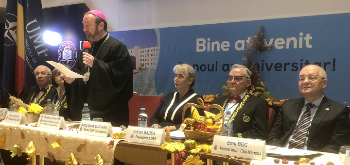 Ierarhul greco-catolic a mai afirmat: „Alianța dintre credință și rațiune, dintre Evanghelie și știință, își poate demonstra în continuare fecunditatea. În timp ce știința îi deschide omului înțelegerea imanenței lumii, credința îi conferă perspectiva transcendenței și orizontul prezenței lui Dumnezeu. Ambele surprind dimensiuni constitutive ale realității, ambele converg în căutarea adevărului și în înfăptuirea binelui. Credința creștină și știința, împreună cu arta, depășesc orice frontieră politică sau ideologică iar întâlnirea lor este generatoare de valori și insuflă speranță. Aflându-ne în sediul Universității de Medicină și Farmacie din Cluj-Napoca, unde libertatea de cercetare și excelența științifică sunt puse în slujba omului, nu putem să nu remarcăm faptul că această instituție universitară poartă numele lui Iuliu Hațieganu, […] ilustrul medic, profesor și rector, fiu al Bisericii Greco-Catolice, fost coleg de clasă la Gimnaziul din Blaj cu Fericitul Cardinal Iuliu Hossu, dar și exponent de excepție al școlii medicale clujene, [care] a lansat în vremea sa un apel care, străbătând timpurile, ajunge până la noi: «Păstrați vie flacăra științei și a conștiinței!» Vă mulțumesc!”