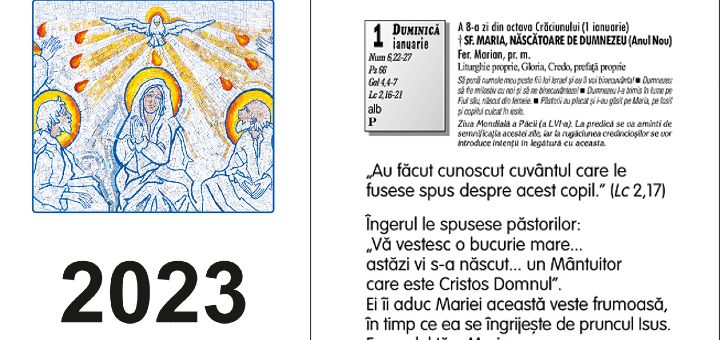 Frazele scurte din fiecare zi sunt din Liturghia zilei după calendarul roman; au fost notate timpurile liturgice, solemnitățile, sărbătorile, comemorările obligatorii, sfinții zilei. Pe verso fiecărei zile au fost preluate caseta și datele din Agenda liturgică 2023 în care se găsesc: ziua și sfântul zilei, note liturgice care indică timpul liturgic, solemnitățile și sărbătorile, lecturile biblice ale Liturghiei, versetul principal care exprimă tema fiecărei lecturi, explicații referitoare la Liturghia zilei, culoarea hainelor liturgice, fazele lunii, zilele în care sunt Rogațiuni, săptămâna psalmilor de la Breviar, alte date cu privire la ziua respectivă.