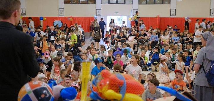 14.06.2023, Iași (Catholica) - Sâmbătă, 10 iunie 2023, la Catedrala Romano-Catolică din Iași, parohia „Adormirea Maicii Domnului” a fost gazda Sărbătorii Copiilor pentru aproximativ 350 de copii din Decanatul de Iași. Tema întâlnirii a fost „Aleargă la Isus”, îndemn pe care copiii l-au trăit la maximum, în această zi frumoasă petrecută împreună. Sărbătoarea copiilor din Decanatul de Iași a început cu o zi însorită, așezată și calmă, cu animatori și preoți care fugeau de colo-colo pentru a pune la punct ultimele detalii. Însă de la sosirea primului grup de copii, curtea Catedralei, plină de baloane, a prins glas și viață. Cu cât soseau mai multe grupuri, cu atât atmosfera devenea mai plină de viață. O forfotă plăcută a luat în stăpânire curtea Catedralei până când animatorii au dat startul acestei zile cu o încălzire prin bansuri. Copiii se simt bine împreună când se distrează împreună.