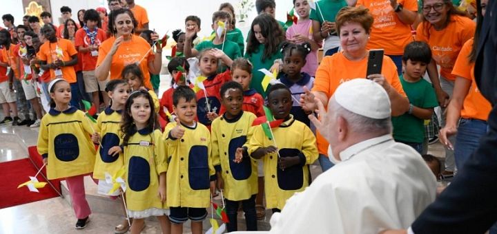 04.08.2023, Lisabona (Catholica) - „Iubire în acțiune” este modul în care Papa Francisc a caracterizat munca altruistă a operatorilor din domeniul carității în cea de-a treia zi a sa din Portugalia, cu ocazia celei de-a 37-a Zi Mondială a Tineretului. Adresându-se vineri, 4 august 2023, dimineață, reprezentanților unor centre de ajutorare și de caritate la Centro Paroquial da Serafina din Lisabona, Papa i-a îndemnat să continue să facă din viață „un dar de iubire și de bucurie”. A spus că nu există o „iubire abstractă”. „Iubirea concretă este aceea care se murdărește pe mâini, și fiecare dintre noi se poate întreba: iubirea pe care o simt pentru toți cei de aici, ceea ce simt pentru ceilalți, este concretă sau abstractă? Când dau mâna cu o persoană în nevoie, cu un bolnav, cu o persoană marginalizată, după ce dau mâna, mă șterg imediat, pentru ca să nu mă ‚infecteze’?”