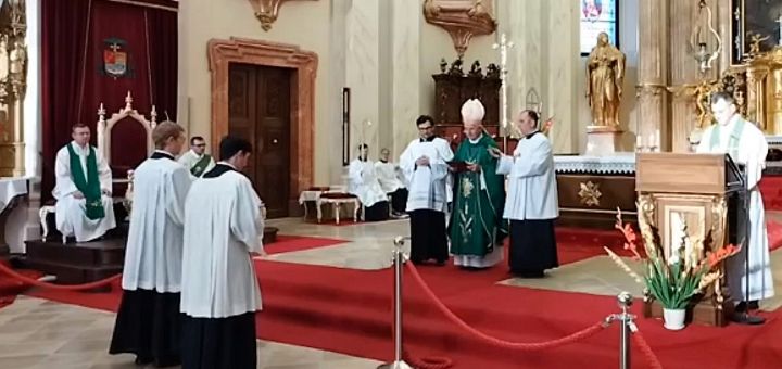 29.08.2023, Timișoara (Catholica) - În cadrul Sfintei Liturghii celebrate de Excelența Sa Iosif Csaba Pál, Episcop diecezan, la ora 18.30, în limba română, în Domul Sf. Gheorghe, Catedrala Romano-Catolică din Timișoara, duminică, 27 august 2023, a avut loc celebrarea admiterii la ordinele sacre – admissio – pentru doi studenți la teologie, ce urmează ulterior să acceadă la treapta diaconatului: Ovidiu Virag din Satu Iosif, filială a parohiei Ciacova, și Branko Marian Duma din Lupac. La Sfânta Liturghie au concelebrat pr. Zsolt Szilvágyi, Vicar episcopal pentru pastorație; pr. Nikola Lauš, canonic, director al Cancelariei Episcopale; pr. Piry Radulov, paroh de Vinga; pr. Tiberiu Szabó, capelan în parohia Timișoara IV Iosefin, asistând și diaconul Francisc Lisi din parohia Lugoj. Cadrul muzical al Sfintei Liturghii a fost asigurat de profesoara Simona Mustețiu.
