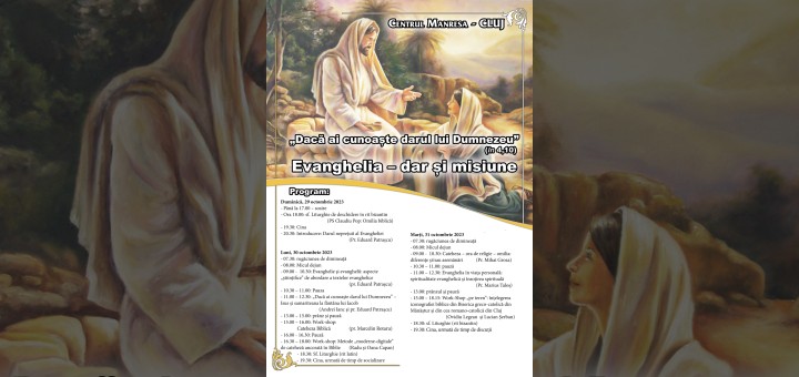 Programul începe duminică, 29 octombrie, cu sosirea de la ora 17:00, pentru ca după o oră să aibă loc Sfânta Liturghie de deschidere, în rit bizantin, celebrată de PS Claudiu Pop, Episcop de Cluj-Gherla. Programul primei zile mai include cina de la 19:30, respectiv o alocuțiune de la 20:30 a pr. Eduard Patrașcu, intitulată „Introducere: Darul neprețuit al Evangheliei”. Ziua de luni va începe la 7:30 cu rugăciunea de dimineață, urmată de la 8:00 de micul dejun. În partea de dimineață vor fi două intervenții: de la 09:00 „Evanghelie și evanghelii: aspecte «științifice» de abordare a textelor evanghelice”, susținută de pr. Eduard Patrașcu, respectiv de la 11:00 „«Dacă ai cunoaște darul lui Dumnezeu» – Isus și samariteana la fântâna lui Iacob”, susținută de Andrei Ianc și pr. Eduard Patrașcu, cu o pauză de 30 de minute între ele. După prânzul și pauza dintre 13:00 și 15:00, va începe un workshop cu pr. Marcelin, despre cateheza biblică, respectiv unul cu Oana și Radu Capan, despre metode „moderne-digitale” de cateheză ancorată în Biblie. De la 18:30 va fi celebrată Liturghia în rit latin, iar de la 19:30 va fi cina, urmată de timp de socializare.