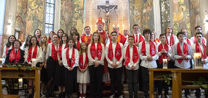 16.10.2023, București (Catholica) - Duminică, 15 octombrie a.c., când Biserica o comemorează și pe Sfânta Tereza din Avila, o mare colaboratoare a Duhului Sfânt și unul din marii mistici ai Bisericii, comunitatea parohiei Preasfântul Mântuitor din București, cunoscută mai bine sub numele de „Biserica Italiană”, s-a împodobit cu o haină de sărbătoare a credinței. În această zi, un număr de 26 de adolescenți și tineri ai acestei parohii l-au primit pe Duhul Sfânt în plinătatea Sa, prin conferirea Sacramentului Sfântului Mir, de către ÎPS Aurel Percă, Arhiepiscop Mitropolit de București. Înaltul oaspete, însoțit de pr. Gabriel-Daniel Popa, secretar eparhial, a salutat grupul emoționat al celor care urmau să fie miruiți și să devină astfel adulți în credință.