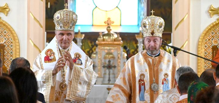 Cei doi Episcopi au fost primiți în fața bisericii de pr. Valer Părău, protopop de Zalău, împreună cu pr. paroh Orest Nichita, care împreună cu un grup de copii îmbrăcați în costume populare, i-au întâmpinat pe oaspeții de onoare cu Sf. Cruce și Sf. Evanghelie, împreună cu un colac tradițional și buchete de flori. La Sf. Liturghie arhierească, cei doi Episcopi, însoțiți de peste 30 de preoți și de ministranți, au intrat în biserică printr-o frumoasă procesiune, timp în care corul bisericii Sf. Familie din Zalău, interpreta cântecul „Creștin sunt din leagăn”, imn al rezistenței greco-catolice în timpul persecuției.