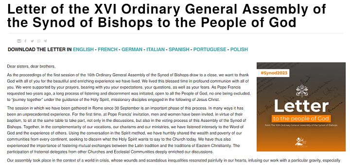 Adunările anterioare ale Sinodului Episcopilor au publicat, de asemenea, mesaje sau scrisori adresate poporului lui Dumnezeu de către Episcopi, numiți și Părinți sinodali. Această scrisoare este prima care a fost aprobată de un Sinod cu cea mai mare participare de până acum a ne-Episcopilor cu drept de vot – aproximativ 21%. „Uniți cu fermitate în speranța adusă de Învierea Sa, i-am încredințat casa noastră comună, unde strigătele pământului și ale săracilor devin tot mai urgente: «Laudate Deum!» (Lăudați-l pe Dumnezeu), așa cum ne-a amintit Papa Francisc la începutul lucrărilor noastre”, se arată în notă. Scrisoarea recunoaște că adunarea de la Vatican a avut loc în mijlocul „unei lumi în criză, ale cărei răni și inegalități scandaloase au rezonat dureros în inimile noastre”.
