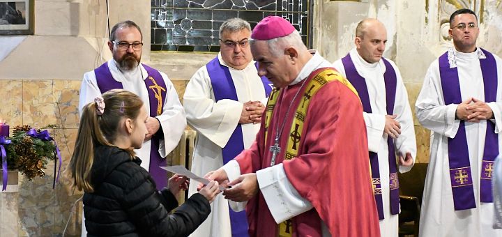 „Astăzi v-ați deschis sufletul, ca să primiți bucuria și iubirea lui Dumnezeu. De când am început Adventul, această bucurie crește în noi. Care lumânare va trebui să o aprindem acum?”, a fost întrebarea adresată de către Excelența Sa Iosif Csaba Pál, Episcop diecezan, la începutul Sfintei Liturghii, tinerilor prezenți. „Pe cea de culoare roz”, au răspuns tinerii. „Lumânările de culoare mov înseamnă pregătire, post, renunțare și așteptare. Cea de culoare roz înseamnă că deja ne bucurăm pentru prezența lui Isus. Nu doar Îl așteptăm, ci deja este aici cu noi”, a subliniat Episcopul diecezan în cuvântul său introductiv. La Liturghie au concelebrat pr. Johann Dirschl, Vicar general, pr. Zsolt Szilvágyi, vicar pastoral, pr. Dorin Gyula Filip decan, paroh de Ciacova, pr. Daniel Pozsonyi, paroh de Jimbolia, pr. Sebastian Mirciov, paroh de Dudeștii Vechi, pr. Augustin Bărbuț, paroh al parohiei Timișoara IX, pr. Szilárd Vodila, paroh de Buziaș și Bacova, pr. Zoltán Kocsik rector al bisericii Ordinului Piarist și directorul Liceului Gerhardinum, pr. Tiberiu Szabo capelan la parohia Timișoara IV Iosefin. Cadrul muzical al Sf. Liturghii a fost asigurat de corul Liceului Gerhardinum, condus de prof. Iustin Călin și corul de tineret al parohiei Timișoara IV Iosefin.