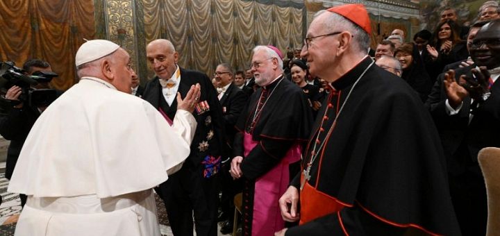 08.01.2024, Vatican (Catholica) - Papa Francisc a ținut luni, 8 ianuarie, un discurs de 45 de minute în fața ambasadorilor statelor cu care Vaticanul are relații diplomatice. Este vorba de 184 de state, precum și cu Uniunea Europeană și cu Ordinul Suveran Militar de Malta. În orașul Roma, există 91 de misiuni diplomatice acreditate pe lângă Sfântul Scaun. Anul trecut, Sfântul Scaun a stabilit relații diplomatice cu țara Oman, cel mai vechi stat independent din lumea arabă. De asemenea, Pontiful a evidențiat în discursul său evoluțiile diplomatice cu Vietnam, unde Vaticanul a trimis pentru prima dată anul trecut un reprezentant papal desemnat. În discursul său, Sfântul Părinte a adresat atât teme generale, cât și situația specifică a unor țări.