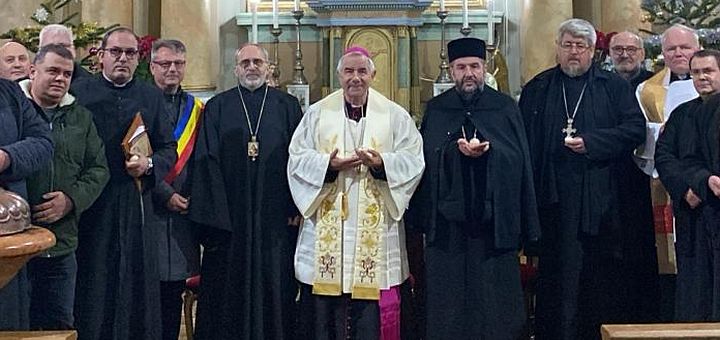 19.01.2024, Timișoara (Catholica) - Comunitatea romano-catolică de limbă română din Slatina Timiș, pr. Sergiu Ștefan Ursache, parohul locului, și biserica sfințită în onoarea sărbătorii Vizitei Sf. Fecioare Maria la verișoara ei, Sf. Elisabeta, au fost gazdele întâlnirii ecumenice din data de 18 ianuarie a.c., care s-a desfășurat în cadrul Octavei de Rugăciune pentru Unitatea Creștinilor. La celebrarea ecumenică de la ora 17.00 au participat Excelența Sa Iosif Csaba Pál, Episcop de Timișoara, Excelența Sa Ioan-Călin Bot, Episcop al Eparhiei Greco-Catolice de Lugoj și Preasfințitul Lucian Mic, Episcop ortodox al Caransebeșului, fiind reuniți totodată și decani/protopopi, preoți și persoane consacrate aparținând celor trei confesiuni, primarul și reprezentanții Primăriei și Consiliului Local din Slatina Timiș și Erwin Josef Țigla, președintele Forumului Democrat al Germanilor din Banatul Montan. Cadrul muzical al celebrării a fost asigurat de către corul acestei comunități.