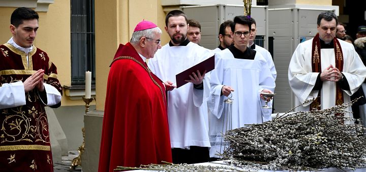 Înainte de Sf. Liturghie pontificală, Păstorul Diecezei a sfințit ramurile în prezența credincioșilor care s-au adunat într-un număr frumos în curtea Palatului episcopal. De aici cei prezenți au pornit în procesiune spre Domul Sf. Gheorghe. În rugăciunea sa E.S. Iosif Csaba Pál, Episcop diecezan, a rostit: „Celebrând, așadar, cu toată credința și evlavia intrarea mântuitoare a lui Isus, să îl urmăm și noi pe Domnul, pentru ca împărtășindu-ne, prin har, de crucea Lui, să avem parte de înviere și viață.” Deoarece în acest an suntem călăuziți de Evanghelia după Sf. Marcu, după ce preoții și credincioșii au intrat în procesiune în biserică, Róbert Bajkai-Fábián, dr. Iulian Ciobotaru și diaconul Branko Duma au citit pasajul din această Evanghelie, care descrie intrarea lui Isus în Ierusalim, patimile și moartea Mântuitorului nostru.