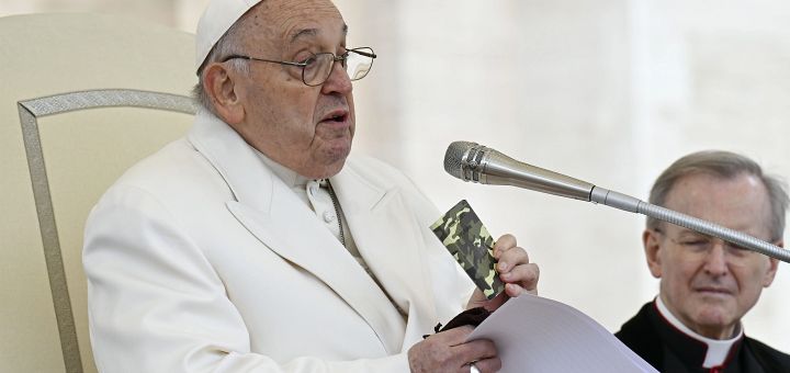 03.04.2024, Vatican (Catholica) - Papa Francisc a ținut în mâini un rozariu și un Nou Testament care au aparținut unui soldat ucrainean de 23 de ani, ucis în război, făcând un apel la pace în timpul audienței sale generale de miercuri. Vorbind în Piața San Pietro pe 3 aprilie, Sfântul Părinte a dezvăluit că rozariul aparținea unui băiat pe nume Oleksandre, care a fost ucis în Avdiïvka, în estul Ucrainei. A spus că Oleksandre a purtat cu el pe frontul războiului din Ucraina și o cărticică cu Noul Testament și Psalmii.