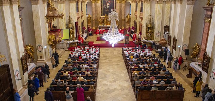 27.04.2024, Timișoara (Catholica) - În acest an aniversarea sfințirii Domului Sfântul Gheorghe, Catedrala romano-catolică din Timișoara a fost sărbătorită printr-o întâlnire și o Sf. Liturghie solemnă la care au participat membrii clerului diecezan, persoanele consacrate și credincioșii. Programul festiv a început în după-amiaza zilei de 23 aprilie, începând cu ora 14:30, cu o întâlnire a preoților, diaconilor, persoanelor consacrate și a colaboratorilor Biroului pentru Pastorația Familiilor, moment găzduit de Aula Magna a Liceului Romano-Catolic Gerhardinum.