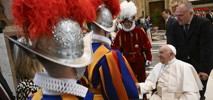 07.05.2024, Vatican (Catholica) - Papa Francisc a primit Corpul Gărzii Elvețiene a Vaticanului cu ocazia depunerii jurământului noilor gărzi, la 6 mai. După ce au participat la o Liturghie în Bazilica San Pietro, 34 de noi recruți și familiile lor au fost primiți de Sfântul Părinte în Palatul Apostolic din Vatican. La ora locală 17.00, tinerii și-au exprimat loialitatea și hotărârea absolută de a-l sluji pe succesorul lui Petru.