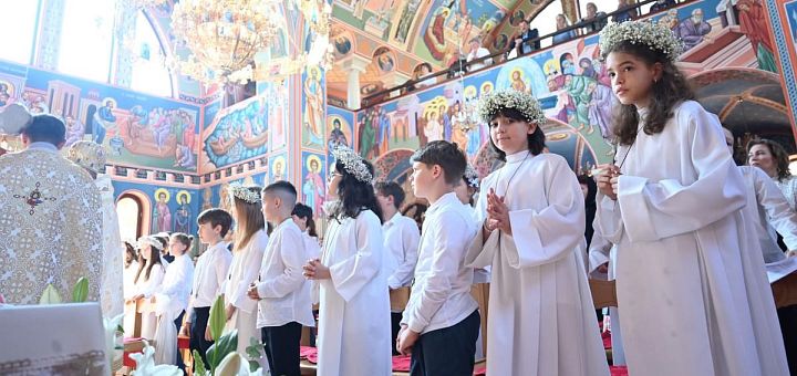 Cu sufletul curat și plin de emoție, copiii au revenit în biserică duminică dimineața, unde, după procesiune, au susținut Sfânta Liturghie, alături de cei dragi și de credincioșii parohiei. Îndrumarea Preasfinției Sale către copii a fost să ia aminte la semnificația cuvintelor: „curaj”, „speranță”, „credință”. Ierarhul le-a insuflat copiilor aceste trei valori care îi va însoți în tot drumul lor, împreună cu Isus Cristos. Însuflețiți de cuvintele Preasfințitului Virgil Bercea, copiii l-au primit pe Isus în inimile lor. Mulțumim pr. Gavril Buboi pentru găzduirea și implicarea în pregătirea evenimentului! Mulțumim ierarhului și preoților concelebranți pentru Liturghia care ne-a umplut inimile de bucurie! Suntem recunoscătoare pentru prezența directorului, prof. Aurelian Andrei Cristea, pentru că ne-a fost alături în această zi memorabilă. Adresăm mulțumiri părinților care ne-au fost aproape atât moral cât și sufletește, pe tot parcursul evenimentului. Nu în ultimul rând, îi mulțumim Bunului Dumnezeu pentru această minunată zi!