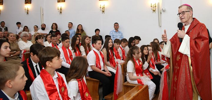 01.06.2024, București (Catholica) - Duminică, 26 mai, la ora 11, Preasfințitul Cornel Damian, însoțit de pr. prof. Eduard Giurgi, Vicar episcopal, a conferit Sacramentul Mirului unui grup de 44 de adolescenți și tineri din parohia Sfinții Apostoli Petru și Paul, din Băneasa. Aceștia provin din partea de nord a Bucureștiului, dar și din localitățile limitrofe. După cum mărturisește pr. paroh Pavel Butnariu, biserica a fost neîncăpătoare pentru mulțimea de credincioși veniți la celebrare.