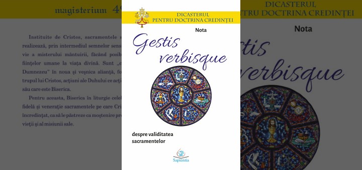17.07.2024, Iași (Catholica) - La Editura Sapientia din Iași a apărut de curând Nota „Gestis verbisque” despre validitatea sacramentelor, scrisă de Dicasterul pentru Doctrina Credinței și tradusă în limba română de pr. dr. Mihai Pătrașcu. Cartea apare în colecția „Magisterium”, în formatul 14×20, are 32 pagini și poate fi procurată de la Librăria Sapientia (www.librariasapientia.ro), precum și de la celelalte librării catolice din țară la prețul de 10 lei.