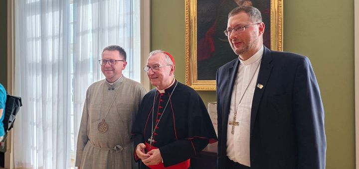 20.07.2024, Lviv (Catholica) - Cardinalul Pietro Parolin a sosit vineri în orașul Lviv din vestul Ucrainei, dând startul unei vizite de șase zile, prima sa vizită în țara devastată de război de la începutul invaziei ruse în 2022. Secretarul de stat al Vaticanului a fost numit legatul pontifical al Papei Francisc pentru celebrarea de încheiere a pelerinajului catolicilor ucraineni de rit latin la Sanctuarul Marian din Berdicev, la vest de Kiev. El va prezida celebrarea de acolo duminică, 21 iulie. La sosirea sa de vineri după-amiază, Cardinalul Parolin, însoțit de Nunțiul Apostolic în Ucraina, Arhiepiscopul Visvaldas Kulbokas, a făcut o scurtă oprire la Curia arhidiecezei romano-catolice de Lviv. Acolo a fost întâmpinat de Arhiepiscopul Mieczyslaw Mokrzycki împreună cu Episcopii auxiliari Edward Kava și Leon Maly. Episcopul Volodymyr Hrutsa, Episcop auxiliar al Arhieparhiei greco-catolice de Lviv, a participat, de asemenea, la reuniune. De asemenea, au fost prezenți primarul din Lviv, Andriy Sadovyi, și șeful administrației regionale din Lviv, Maksym Kozytskyi