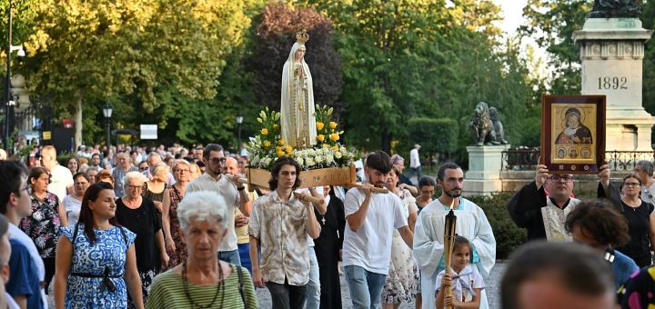 16.08.2024, Oradea (Catholica) - La Sanctuarul eparhial „Maica Domnului” din Oradea, care ne invită an de an să ne unim în rugăciune mai ales la celebrarea sfintei sărbători a Adormirii Maicii Domnului, biserica se umple de adorație și haruri divine. În prag de mare sărbătoare, cu credința și speranța că mama sfântă ne va purta în brațele ei pline de iubire, cei veniți să ia parte la procesiunea cu statuia Fecioarei Maria de la Fatima și cu icoana Sfintei Fecioare Maria Regina Familiei Franciscane și-au luminat sufletele prin recitarea Rozariului. Pornind de la Sanctuarul eparhial, pașii, cântările și rugăciunile în cinstea Maicii Cerului au fost profunde și cu sinceră dăruire, grupul remarcabil de pelerini răspândindu-și credința.