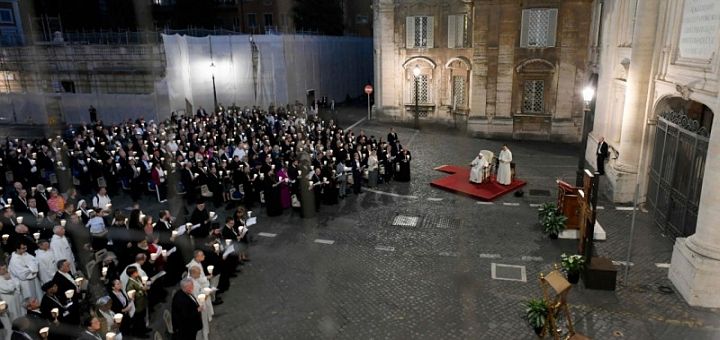 11.10.2024, Vatican (Catholica) - Papa Francisc și participanții la Sinodul despre sinodalitate, inclusiv delegații necatolici, s-au rugat împreună vineri seara la locul unde au fost martirizați primii creștini în Roma. Vigilia ecumenică de rugăciune din 11 octombrie a avut loc în Piața Protomartirii Romani din interiorul Orașului Vatican. Piața este considerată a fi locul unde Sf. Petru și alți primi martiri creștini din Roma au fost uciși din ordinul împăratului Nero. O placă în pavaj marchează locul în care a fost răstignit Sf. Petru. În timpul celebrării ecumenice de 45 de minute, care a inclus cântări, rugăciuni și litanii, participanții au ținut lumânări cu protecții de picurare imprimate cu o imagine a picturii din secolul al XV-lea „Mater Ecclesiae” („Mama Bisericii”).