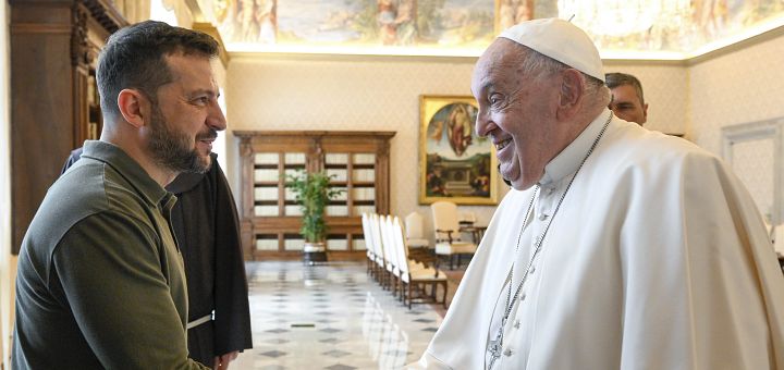 11.10.2024, Vatican (Catholica) - Papa Francisc s-a întâlnit vineri dimineață cu președintele ucrainean Volodimir Zelenski într-o audiență privată la Palatul Apostolic din Vatican, asigurându-l pe liderul politic de rugăciunile sale continue și ale Bisericii universale pentru poporul ucrainean. Sfântul Părinte i-a dăruit lui Zelenski un relief din bronz reprezentând o pasăre mică lângă o floare cu mesajul gravat „La Pace E’ Un Fiore Fragile” („Pacea este o floare fragilă”), precum și o copie a „Mesajului pentru pace” din acest an. Zelenski a primit, de asemenea, două cărți de la Sfântul Părinte, inclusiv „Statio Orbis” din 2020 și „Persecutați pentru adevăr: greco-catolicii ucraineni în spatele Cortinei de Fier”.