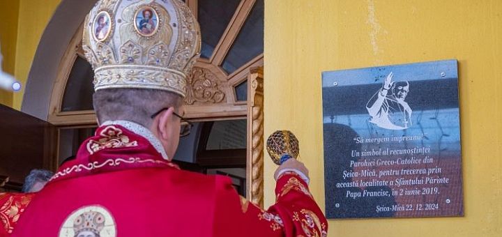 23.12.2024, Blaj (Catholica) - Cu binecuvântarea Preafericitului Părinte Cardinal Lucian Mureșan, duminică, 22 decembrie 2024, Preasfinția Sa Cristian, Episcop auxiliar de Alba Iulia și Făgăraș, a sfințit placa comemorativă cu ocazia împlinirii a cinci ani de la vizita apostolică în România a Sfântului Părinte Papa Francisc și de la trecerea prin comuna Șeica Mică a singurului Papă care a vizitat aceste meleaguri transilvănene. Placa aniversară a fost amplasată la intrarea în biserica cu hramul „Sfinții Apostoli Petru și Pavel” din parohia greco-catolică Șeica Mică, protopopiatul Blaj.
