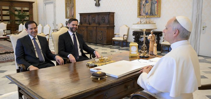 19.05.2025, Vatican (Catholica) - Papa Leon al XIV-lea a avut în această dimineață o întâlnire privată cu vicepreședintele american JD Vance și cu secretarul de stat american Marco Rubio în biblioteca papală. Detaliile întâlnirii nu au fost făcute publice, dar americanii au discutat ulterior cu un diplomat de rang înalt al Vaticanului despre probleme americane și internaționale. Audiența papală de 45 de minute a început cu un tête-à-tête între Vance și Papă, Rubio alăturându-se după aceea. A doua doamnă, Usha Vance, soția lui Rubio, Jeanette Dousdebes Rubio, și întreaga delegație americană s-au alăturat pentru partea finală a întâlnirii, care a inclus schimbul obișnuit de cadouri.