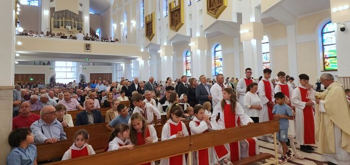 Ziua de sâmbătă s-a încheiat cu celebrarea Sfintei Liturghii din ajun de hram, prezidată de Episcop. În cadrul predicii, Preasfințitul a pus accentul pe importanța devoțiunii către Inima lui Isus și Inima Mariei, îndemnându-ne să luăm exemplul acestor inimi, să căutăm să avem o inimă bună, iubitoare, plină de compasiune și grijă față de aproapele, să ne ferim în a-i judeca pe ceilalți și mai degrabă să ne întrebăm cât de mult se aseamănă inima noastră cu Inima lui Isus și Inima Mariei: „Dumnezeu, care cunoaște inima omului, a cunoscut foarte bine inima Fecioarei de la Nazaret, prea asemănătoare cu cea a Fiului ei, Isus, de aceea i-a încredințat misiunea de a fi Mama Răscumpărătorului nostru. Dumnezeu a ales și a pregătit această tânără pentru că a găsit în ea o inimă împodobită cu toate virtuțile.”