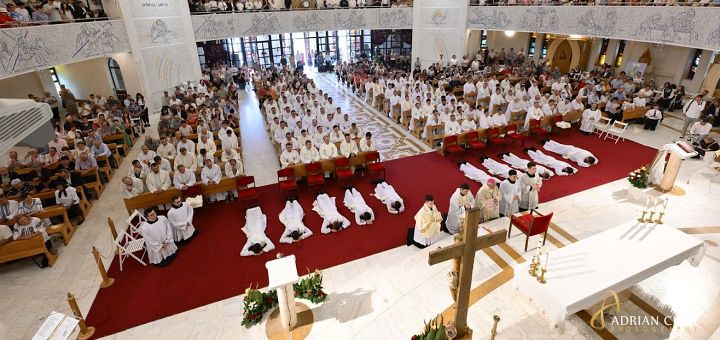 25.06.2025, Iași (Catholica) - În solemnitatea Nașterii lui Ioan Botezătorul, zece diaconi au fost sfințiți preoți în Catedrala „Sfânta Fecioară Maria, Regină” din Iași, prin impunerea mâinilor și rugăciunea de consacrare a PS Iosif Păuleț, care a prezidat întreaga celebrare: opt diecezani și doi franciscani minori conventuali. Au participat PS Petru Sescu, Episcop auxiliar de Iași, PS Thomas Deenihan, Episcop de Myth, Irlanda, PS Denis Nulty, Episcop de Kildare and Leighlin, Irlanda, PS Aníbal Saldaña Santamaría, Episcop al Prelaturii Bocas del Toro, Panama, preoți din seminariile de formare, oaspeți și numeroși credincioși. Evenimentul a fost transmis la Radio ERCIS FM și pe postul Angelus TV.