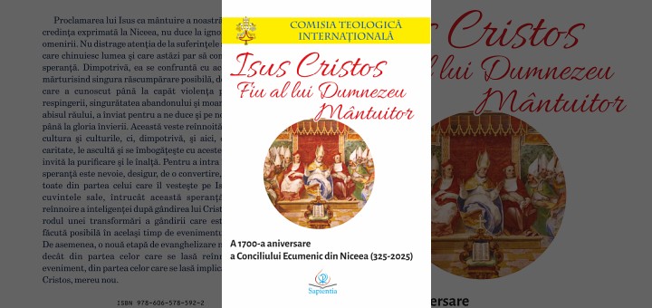 28.06.2025, Iași (Catholica) - La Editura Sapientia din Iași a apărut recent cartea: „Isus Cristos, Fiu al lui Dumnezeu, Mântuitor – A 1700-a aniversare a Conciliului Ecumenic din Niceea (325-2025)”, scrisă de Comisia Teologică Internațională și tradusă în limba română de pr. dr. Mihai Pătrașcu. Cartea apare în colecția „Magisterium”, în formatul 14×20, are 130 p. și poate fi procurată de la Librăria Sapientia (www.librariasapientia.ro), precum și de la celelalte librării catolice din țară la prețul de 20 lei. Redăm din introducerea la document: