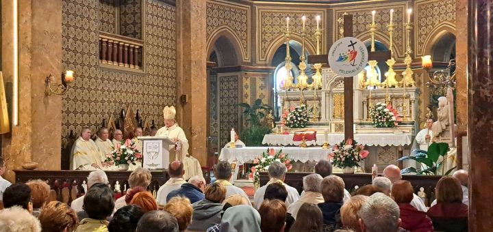 Un prim moment semnificativ în cadrul Sfintei Liturghii a fost reprezentat de binecuvântarea apei cu care au fost stropiți cei prezenți, inclusiv cele două plăci comemorative care să amintească de cele două momente aniversare. În cadrul predicii de la Sfânta Liturghie, Înaltpreasfințitul Aurel Percă, având ca repere noua temă a Anului Pastoral – „Chemați să fim o Biserică vie și evanghelizatoare”, fragmentul evanghelic despre întâlnirea lui Isus cu femeia samariteană (Ioan 4,5-39) și comemorarea Sfântului Vincențiu de Paul, a evidențiat mai multe aspecte cum ar fi: bucuria de a fi împreună ca familie a lui Dumnezeu; Biserica este vie prin rugăciune și comuniune, nu doar o instituție; caracterul misionar al Bisericii și al fiecărui creștin, indiferent de statutul său, asemenea femeii samaritene care a devenit misionară după dialogul cu Isus.