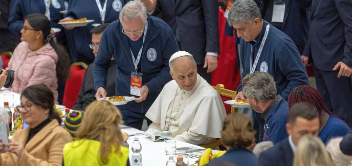 17.11.2025, Vatican (Catholica) - Papa Leon al XIV-lea a luat prânzul duminică cu peste 1.300 de persoane care se confruntă cu sărăcia și excluziunea socială, reunindu-se cu acestea în Aula Paul al VI-lea din Vatican pentru o masă festivă care a marcat Ziua Mondială a Săracilor. Aula a fost transformată pentru această ocazie într-o vastă sală de mese. Evenimentul a fost organizat de Congregația Misiunii în numele misionarilor vincențieni din întreaga lume, care în acest an sărbătoresc cea de-a 400-a aniversare a fondării Congregației lor și a Fiicelor Carității. Voluntarii au servit lasagna, pui pane cu cartofi și desertul tradițional italian babà.
