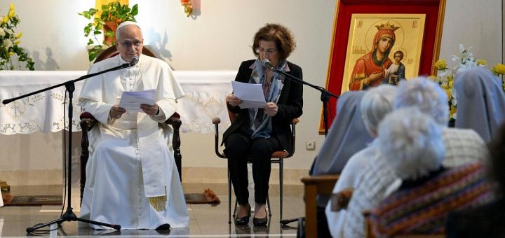 În timp ce Pontiful mergea pe culoar, un cor de femei – compus din imigrante din Congo, Angola, Camerun și Burkina Faso – a cântat „Ave Maria” și „Laudate Dominum”. Sfântul Părinte a salutat mai multe persoane, s-a oprit pentru a face fotografii și a schimba câteva cuvinte, apoi a îngenunchiat scurt în rugăciune în fața Preasfântului Sacrament. Sr. Margaret Searson, care a sosit de la Londra cu doar o lună în urmă, a vorbit în numele comunității. I-a mulțumit Papei pentru vizita sa, spunând că aceasta le va arăta rezidenților casei „că Dumnezeu îi iubește nespus”. La rândul său, Papa le-a mulțumit surorilor pentru primirea și pentru munca lor. A oferit câteva reflecții asupra numelui lor, care, a spus el, oferă un indiciu asupra adevăratului sens al carității creștine. „Domnul v-a chemat nu numai să ajutați sau să sprijiniți pe cei săraci”, a spus Sfântul Părinte, ci și „să fiți surorile lor! … Înainte de a fi pentru ceilalți, trebuie mai întâi să fim cu ceilalți într-o comuniune bazată pe fraternitate”.