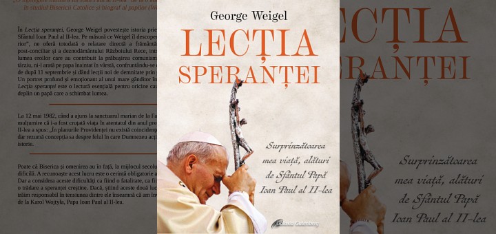 04.02.2026, Târgu Lăpuș (Catholica) - Editura Galaxia Gutenberg anunță apariția cărții „Lecția speranței. Surprinzătoarea mea viață alături de Sfântul Papă Ioan Paul al II-lea”, scrisă de George Weigel și tradusă în limba română de Ana-Maria Botnaru. Cartea are 306 pagini, format 16×23, și poate fi comandată în perioada lansării la prețul promoțional de 49 de lei. Amintim că autorul mai are cărți apărute la aceeași editură, între care și „Martor al speranței. Biografia Papei Ioan Paul Al II-lea (1920-2005)”. Redăm în continuare prezentarea noutății editoriale conform textelor de pe coperta IV.
